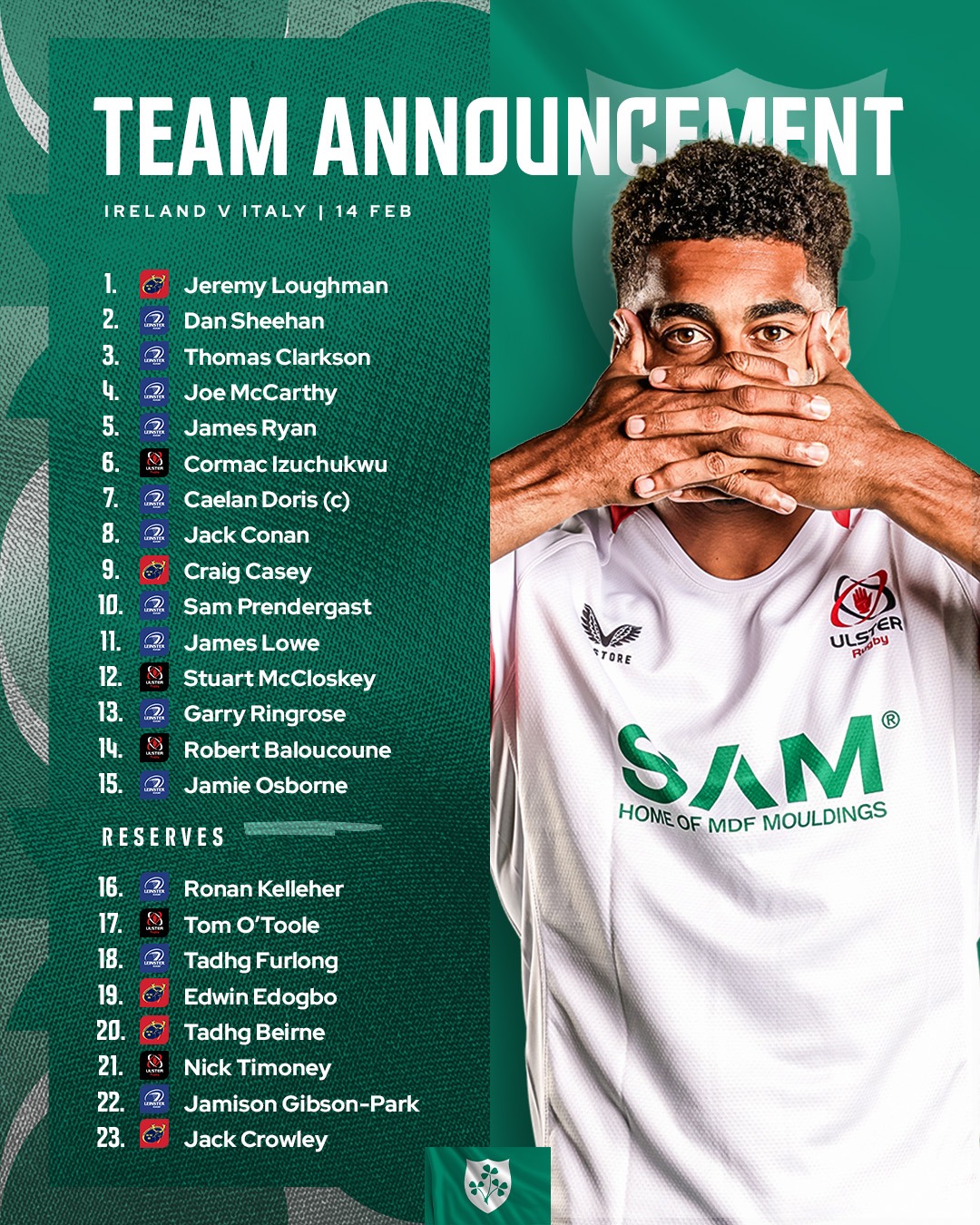 Replacements: Kelleher, O’Toole, Furlong, Edogbo, Beirne, Timoney, Gibson-Park, Crowley.