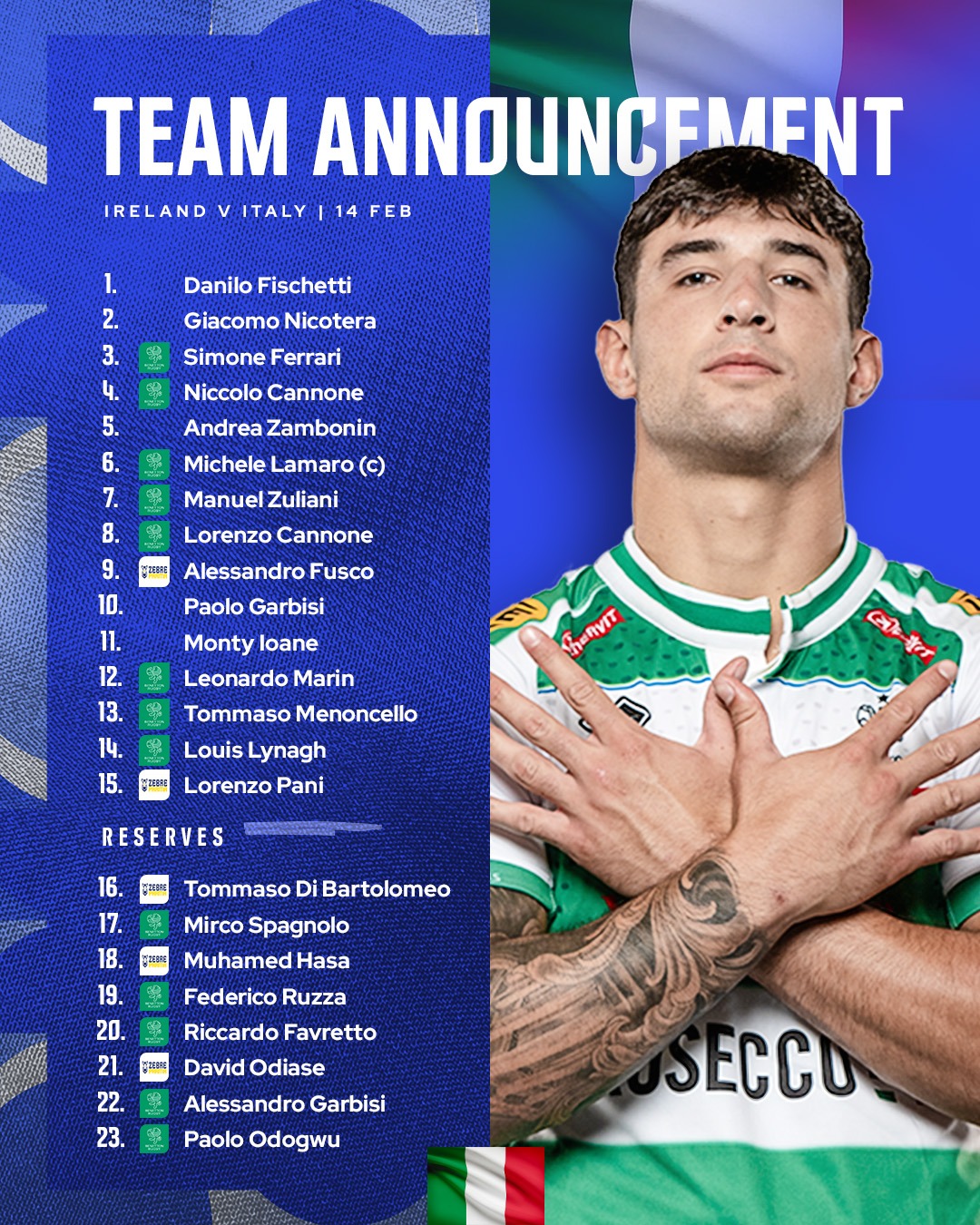 Italy: Pani; Lynagh, Menoncello, Marin, Ioane, P Garbisi, Fusco; Fischetti, Nicotera, Ferrari; N Cannone, Zambonin; Lamaro (c), Zuliani, L Cannone.