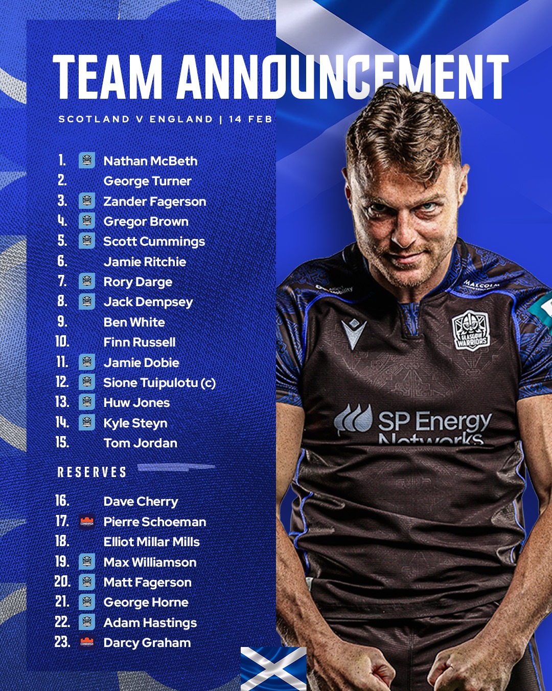 Scotland: Jordan, Steyn, Jones, Tuipulotu (capt), Dobie, Russell, White; McBeth, Turner, Z Fagerson, Brown, Cummings, Ritchie, Darge, Dempsey.