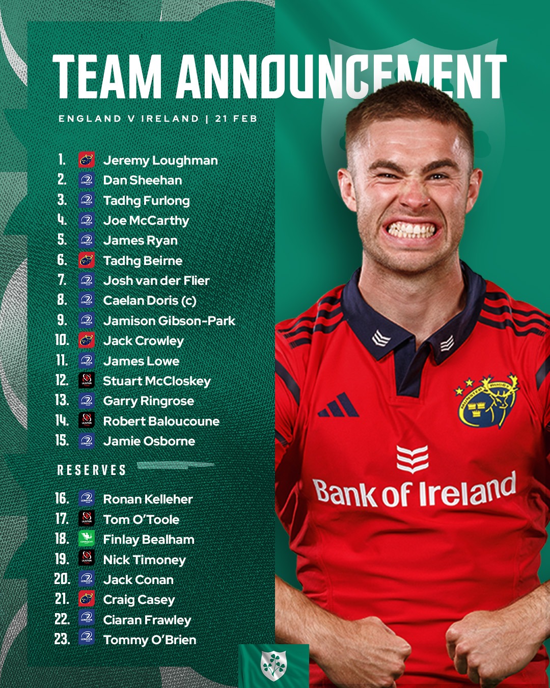 Replacements: Kelleher, O’Toole, Bealham, Conan, Timoney, Casey, Frawley, O’Brien