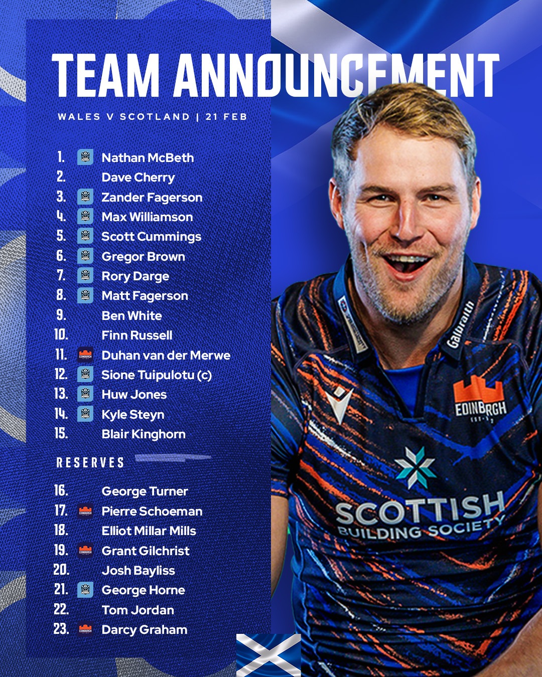For Scotland, an injury to Jamie Dobie opens the door for Duhan van der Merwe to return to the starting XV, adding Edinburgh representation. Glasgow pair Max Williamson and Matt Fagerson are also recalled.