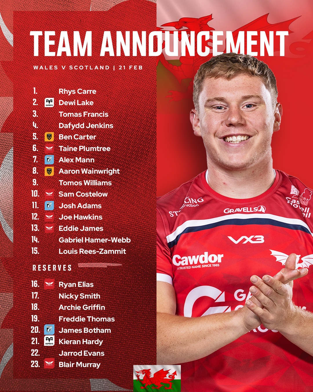 Tandy has made several changes in search of improvement. Scarlets fly-half Sam Costelow replaces Dan Edwards at 10, while Taine Plumtree comes into the back-row. Ben Carter earns recognition for his strong form with Dragons RFC this season, and Scarlets’ Blair Murray is included to provide impact from the bench.
